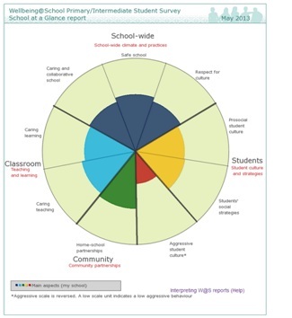 IMPORTANT NOTE: The Aggressive student culture aspect is different from the others. A small section indicates lower levels of aggressive behaviour and a larger coloured section shows higher levels.